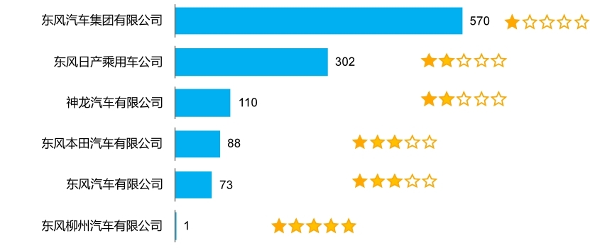 采用企业供应链中存在违法行为的供应商占比反映企业供应链管理水平。其中,在调研的74家汽车制造企业中,供应链平均违法占比为22.25%,而东风旗下的四家企业均超过这一均值,且神龙汽车以23.85%的比例位居第一,其次是东风本田、东风汽车和东风柳汽。